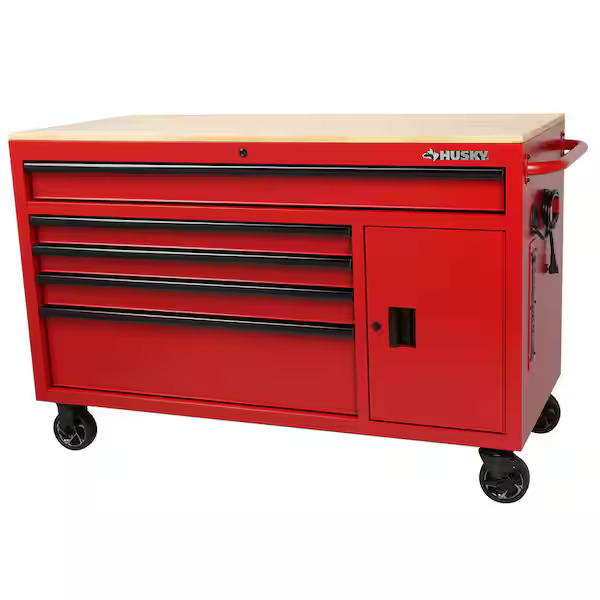 61 In. W X 22.1 in D Standard Duty 7-Drawer 1-Door Mobile Workbench Tool Chest with Solid Wood Top in Gloss Red